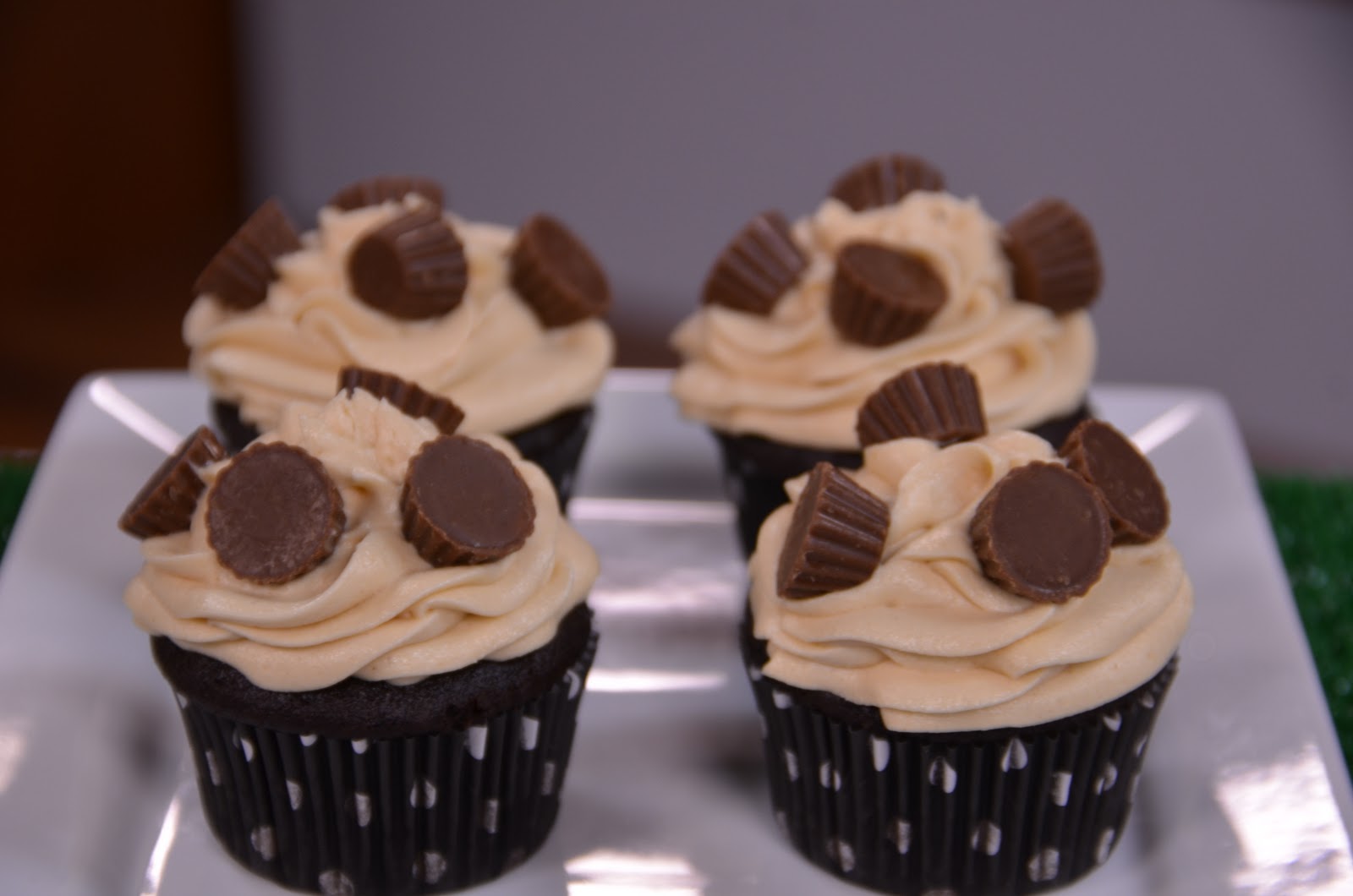 These are chocolate cupcakes with peanut butter cream cheese frosting that is so stinkin' yummy. I have a link at the end of this post with the recipe. I topped them off with some very dangerous Reese's peanut butter cup minis. I have to remind myself that just because they're MINI, does NOT mean I can eat handful after handful of these scrumptious little suckers.